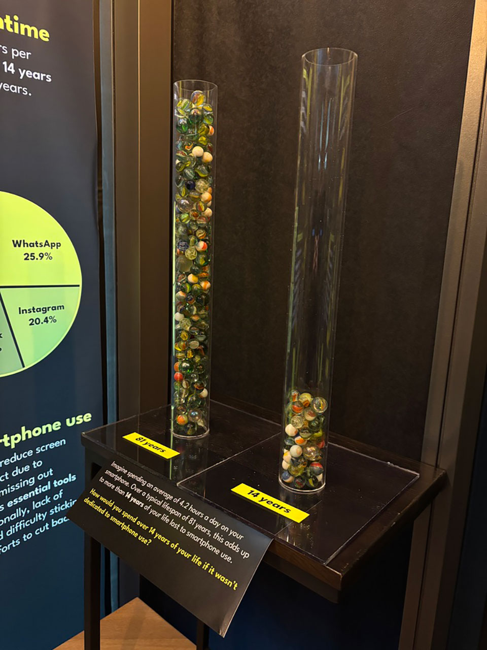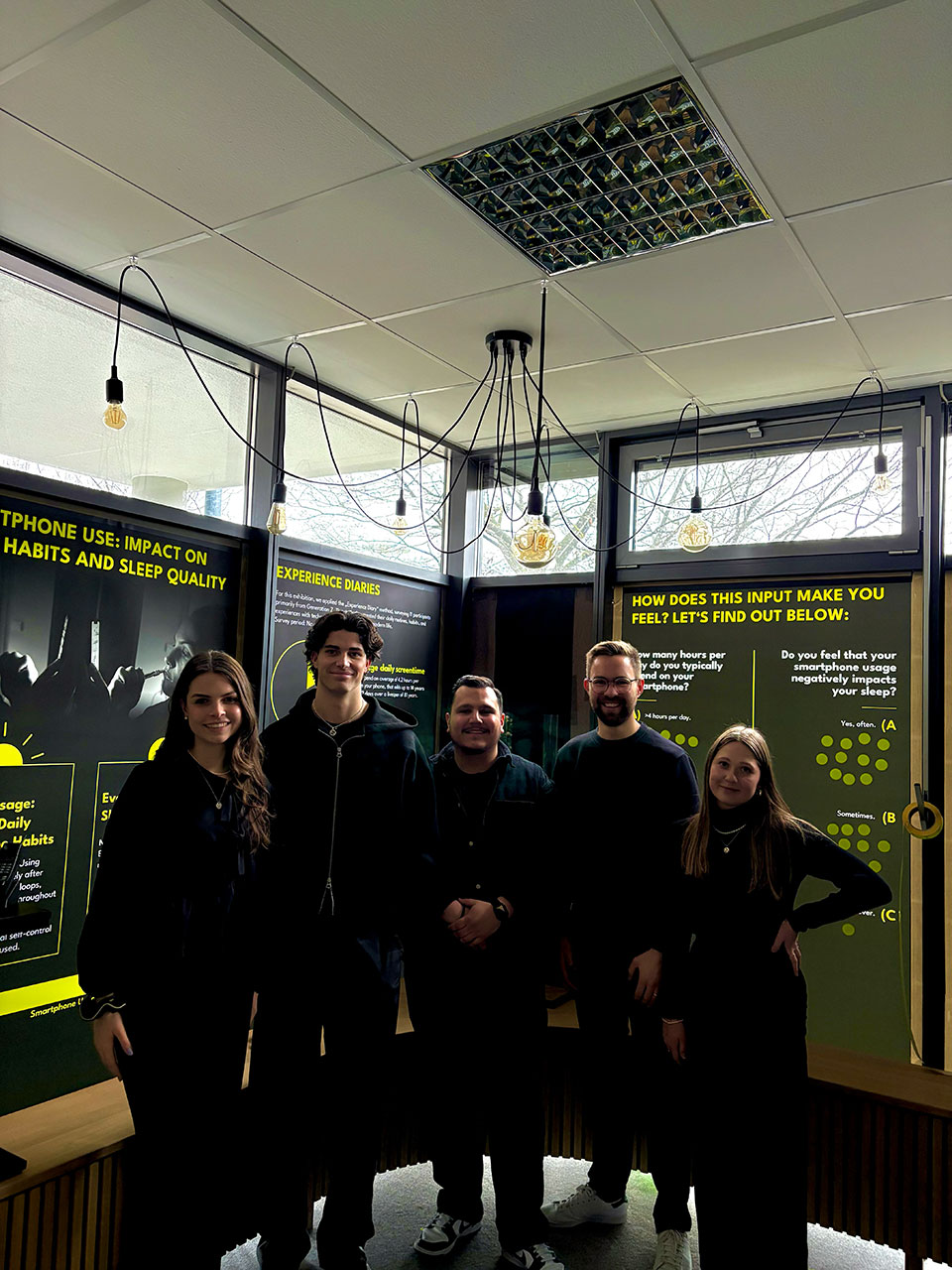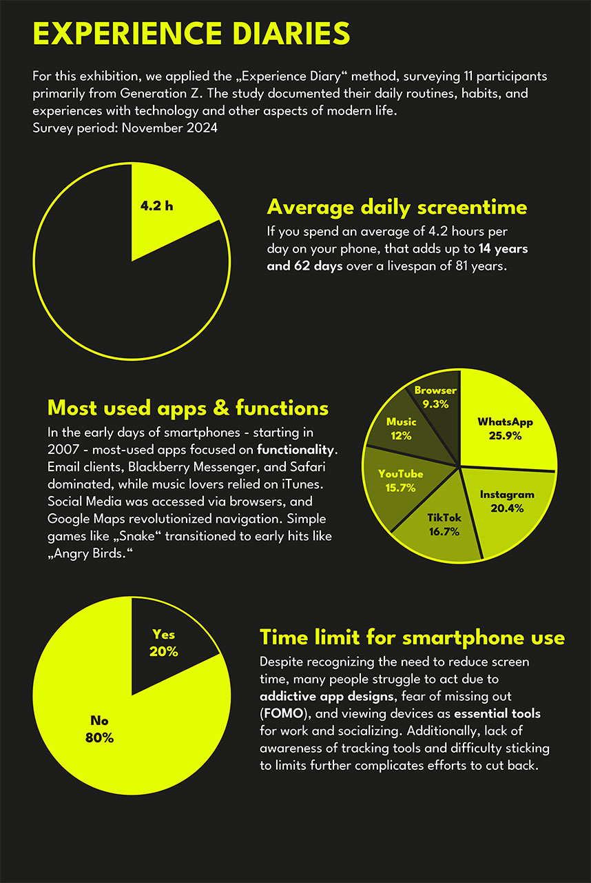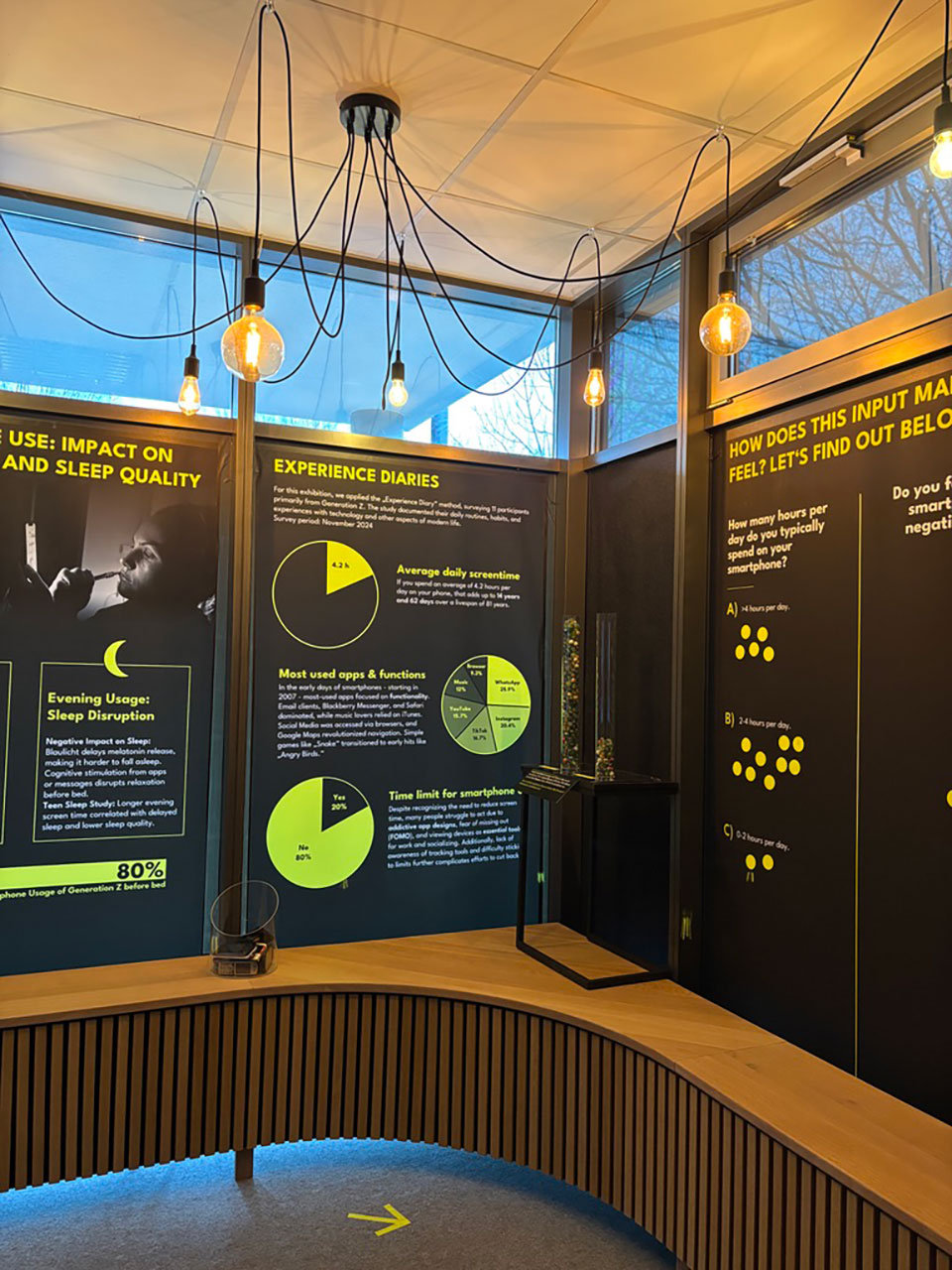 The interactive component of the exhibition was particularly important to us. Here, participants were able to experience significant ‚aha‘ effects using posters attached to the windows of the stations and by answering recurring questions about their own use. The penultimate station provided an opportunity for reflection without digital distractions, where visitors could sit down and think about what they had seen. Finally, there were small giveaways that served as a daily reminder of the exhibition’s key messages and insights. Our project highlighted how ubiquitous and often unnoticed smartphone addiction is in our everyday lives and emphasized the need to consciously recognize and address this development. Through our work, we wanted to contribute to raising awareness and educating people about the risks and side effects of digital addiction, with the aim of improving the user experience in such a way that it encourages critical self-reflection and changes in usage behavior.