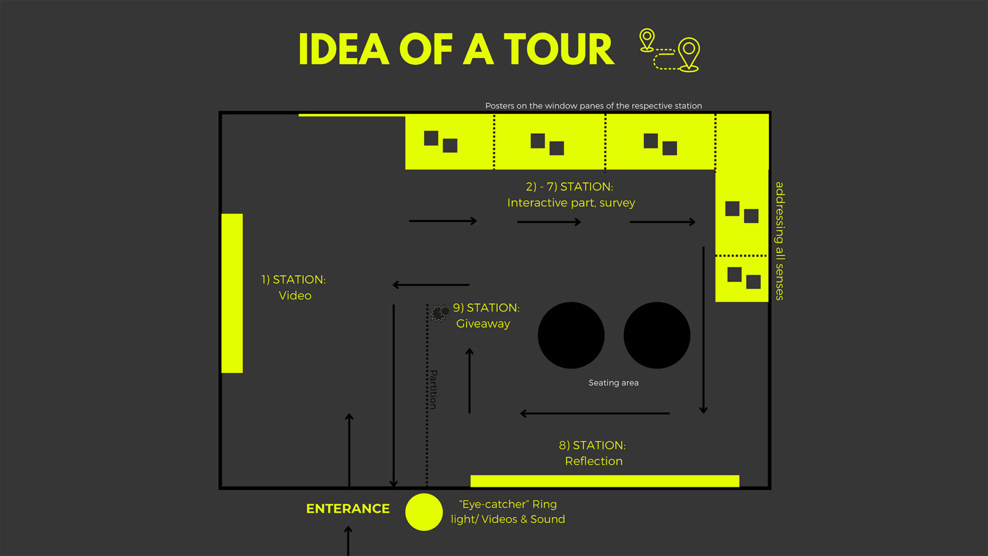 Besonders wichtig sind uns die interaktiven Komponenten der Ausstellung. Hier können die TeilnehmerInnen anhand von Postern, die an den Fensterscheiben der Stationen angebracht sind, und durch Beantwortung wiederkehrender Fragen über ihre eigene Nutzung, signifikante ‘Aha-Effekte’ erleben. Die vorletzte Station bietet eine Gelegenheit zur Reflexion ohne digitale Ablenkungen, wo sich Besucher setzen und über das Gesehene nachdenken können. Zum Abschluss gibt es kleine Giveaways wie Aufkleber. Unser Projekt verdeutlicht, wie allgegenwärtig und oft unbemerkt die Smartphone-Sucht in unseren Alltag eindringt und betont die Notwendigkeit, diese Entwicklung bewusst zu erkennen und zu adressieren. Durch unsere Arbeit möchten wir einen Beitrag zur Sensibilisierung und Aufklärung über die Risiken und Nebenwirkungen der digitalen Abhängigkeit leisten, mit dem Ziel, die User Experience so zu verbessern, dass sie zur kritischen Selbstreflexion und Änderung des Nutzungsverhaltens anregt.