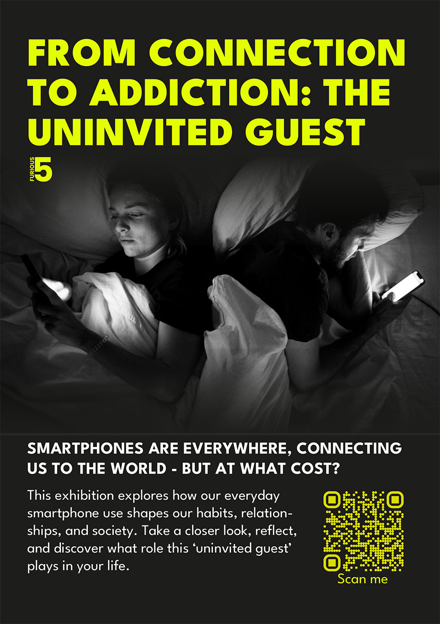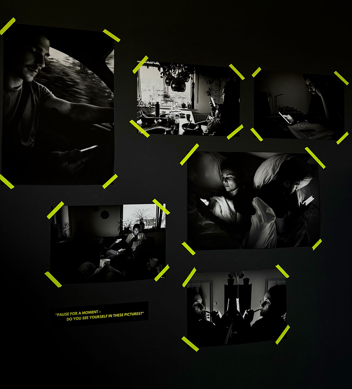 Unsere Ausstellung “From connection to addiction – the uninvited guest” möchte ein Bewusstsein für die tiefgreifenden Auswirkungen der Smartphone-Nutzung auf soziale Verbindungen und individuelle Verhaltensweisen schärfen. Dabei nehmen wir eine möglichst objektive, nicht urteilende Perspektive ein, die dennoch Empathie schafft. Die interaktive Ausstellungstour führt die Besucher durch verschiedene Stationen, an denen sie zur Reflexion über ihre eigene Smartphone-Nutzung angeregt werden. Die Tour beginnt mit einem Video, das den Einfluss von Smartphones auf den Alltag illustriert. Die Stationen, die die BesucherInnen innerhalb der Tour durchlaufen bieten Fakten und interessante Informationen, um eine solide Basis für das Verständnis des Themas zu schaffen. Die Fotografien zeigen Alltagssituationen, die jeder kennt und mit denen man sich selbst identifizieren kann. Man fühlt sich manchmel fast selbst ertappt und möchte etwas ändern.