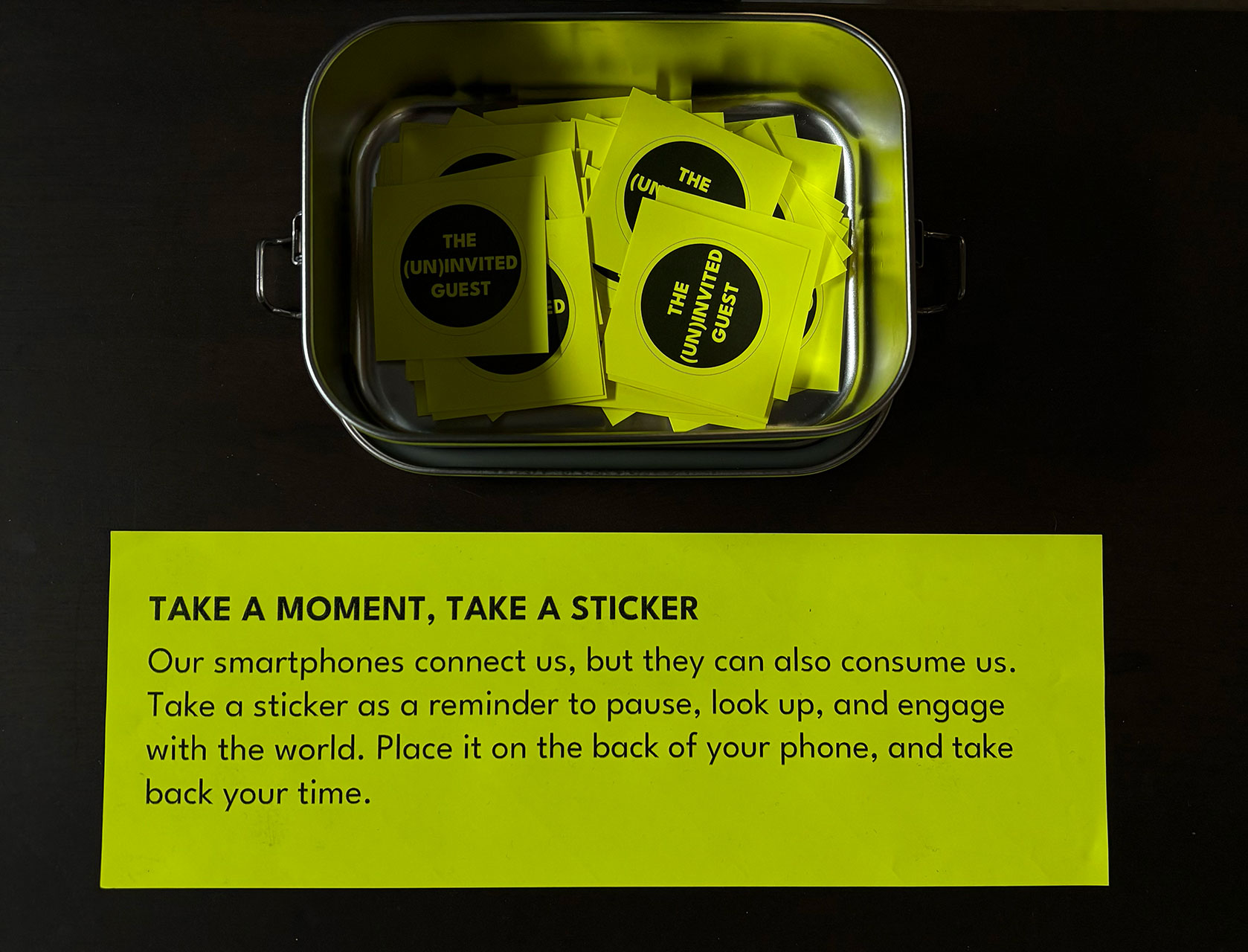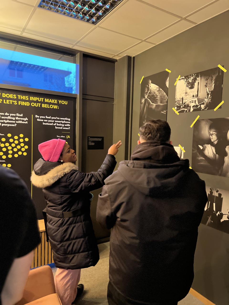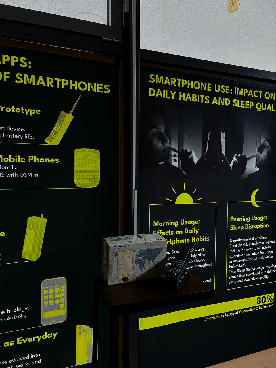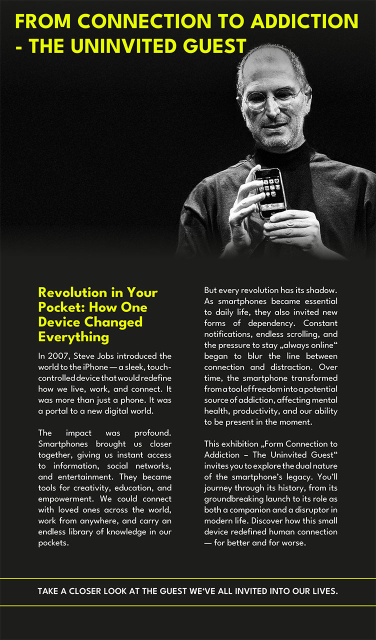 Our project “From connection to addiction – the uninvited guest” aimed to raise awareness of the profound impact of smartphone use on social connections and individual behaviors. We wanted to promote a non-judgmental perspective and focus on both responsibility and empowerment. Our central question was: “How can we design an experience that creates empathy?” To achieve this, we developed an interactive exhibition tour that took visitors through various stations where they were encouraged to reflect on their own smartphone use. The tour began with an introductory video that illustrated the impact of smartphones on everyday life, followed by stations that provided facts and interesting information to create a solid basis for understanding the topic.